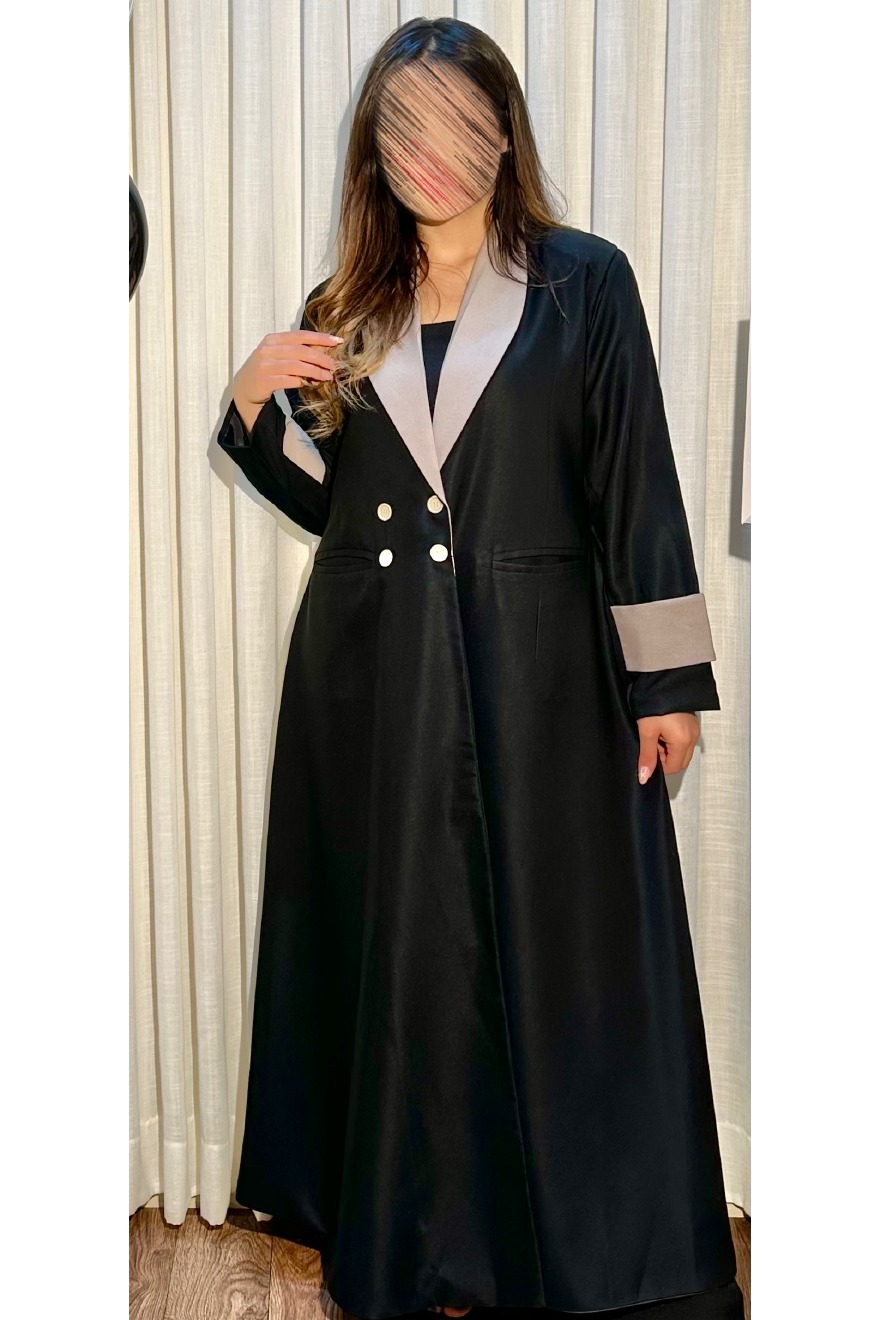 عباية سوداء أنيقة بتصميم مستوحى من قصّة البليزر الكلاسيكية تمنحك إطلالة رسمية راقية للعمل والمناسبات.
